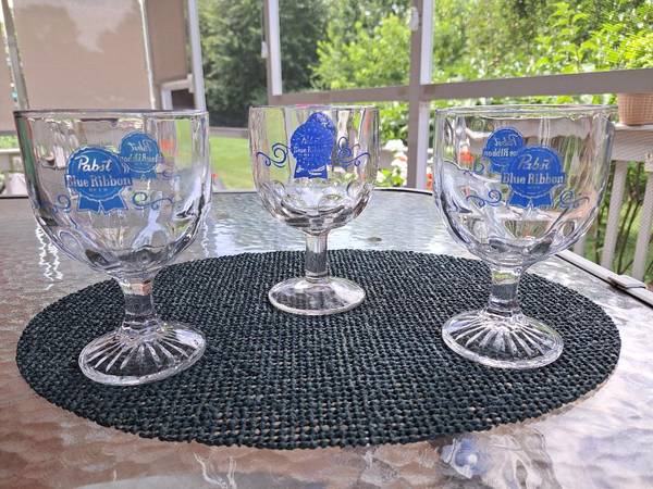 Very clean Pabst Blue Ribbon heavy glass thumbprint goblets. 6” high x 4” wide x 4” deep. Blue Pabst logo and script on both sides. In excellent vintage condition with no chips or cracks and ready...