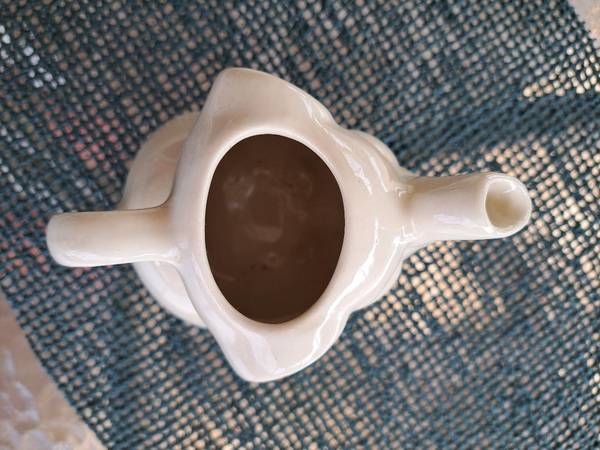 It regally stands 4-1/2” high x 5-1/2” long from spout to handle, and the bottom says “Patented USA”. It’s in excellent, like-new condition with no cracks, chips or crazing, and obviously Made in the USA!