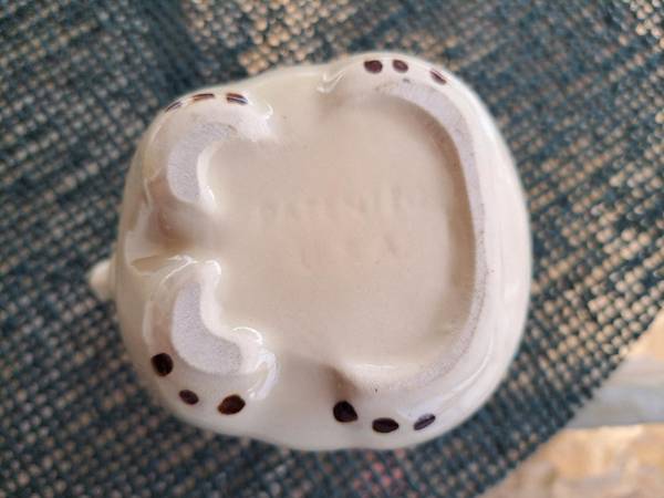 As is with a lot of vintage Shawnee pieces, this elephant’s look is very clean and simple…just a cream-colored body with gray tusks, brown eyes and feet, and red ears and mouth. Its raised trunk is the creamer’s pouring spout, and its tail is curling around and up to make the handle!