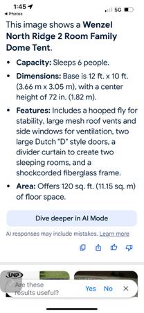 Preowned tent 6 person no rips or tears, right screen door needs new zipper