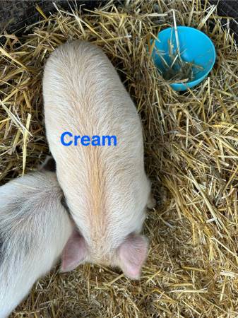 2 gilts ready for their new homes. Raised by hand and highly socialized these girls are bursting with personality sassy, sweet, and steady. Both very friendly and excited for their own space. Double wattled. From a registered boar but unregistered sow.