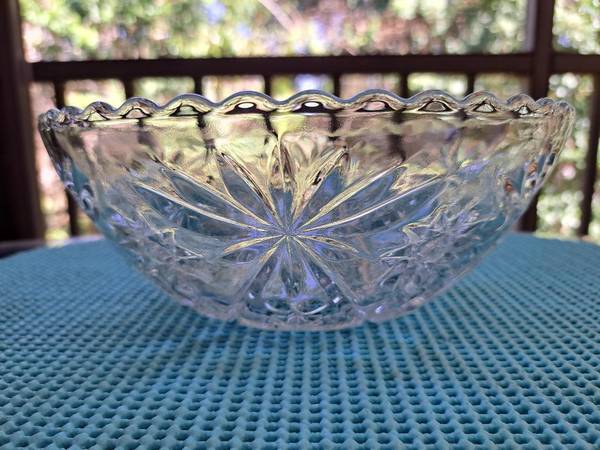 Part of the Early American Prescut Clear collection, this pressed glass bowl’s beautiful star pattern and scalloped edges makes it quite a beauty!