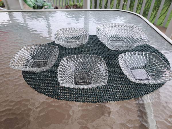 The crisscross diamond pattern and scalloped edges beautifully catch the light on this set of 5 Early American Clear bowls! The 4 small are 4-3/4” in diameter x 1-1/2” high, and the 1 large is 6-1/2” in diameter by 2-1/4” high. They’re in like-new condition with no chips or cracks