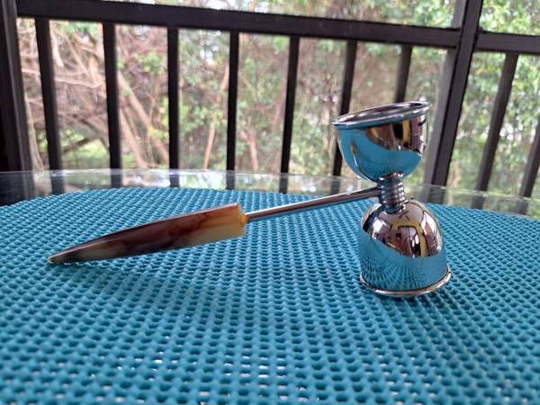 Vintage double or single chrome shot jigger with a faux tortoise shell handle.