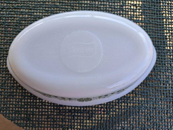 This 10” oven-to-table oval casserole dish showcases a sweet green daisy pattern on white milk glass. It measures 10” long from handle to handle, 6-1/4” wide, and 2-3/4” deep. There is no lid.