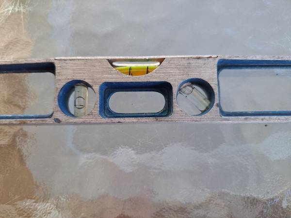 Blue interior color on an aluminum frame. The horizontal (yellow), vertical (clear), and diagonal (clear) glass level bubbles are intact and work correctly. 9” long x 1-1/8” high x 1/2” wide. In...